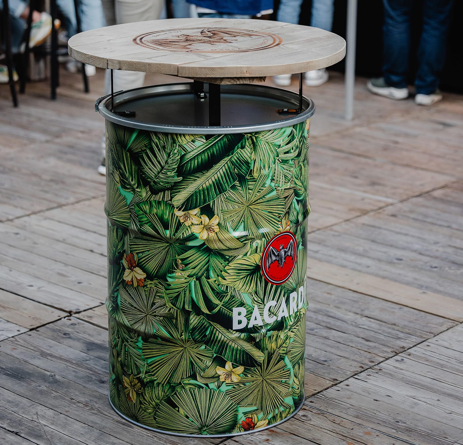 Ein Table Barrel ist ein robustes, vollständig Individuell gestaltbar Stehtisch aus einer Stahltrommel kombiniert mit einem großen Markentischplatte. Es ist ein multifunktionales Element, das Nutzen und Design vereint und jeden Raum in eine Markenumgebung verwandelt. Dank seines auffälligen Aussehens und praktischen Formats ist er ideal für stark frequentierte Veranstaltungen, Aktivierungen, Einzelhandelsbereiche, Messen oder Gaststätten.